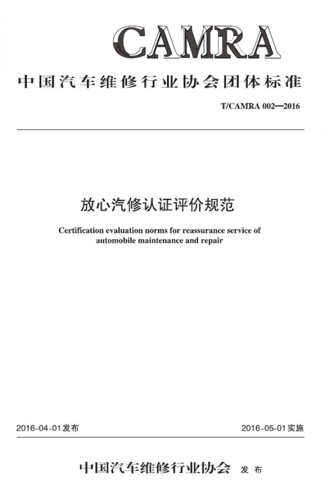 4月1日 協會發布首個團體標準《放心汽修認證評價規范》(T/CAMRA002-2016),該標準經中國汽車維修行業協會標準化技術委員會審查通過,并經中國汽車維修行業協會批準為推薦性團體標準,自2016年5月1日起實施。