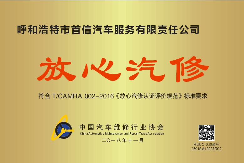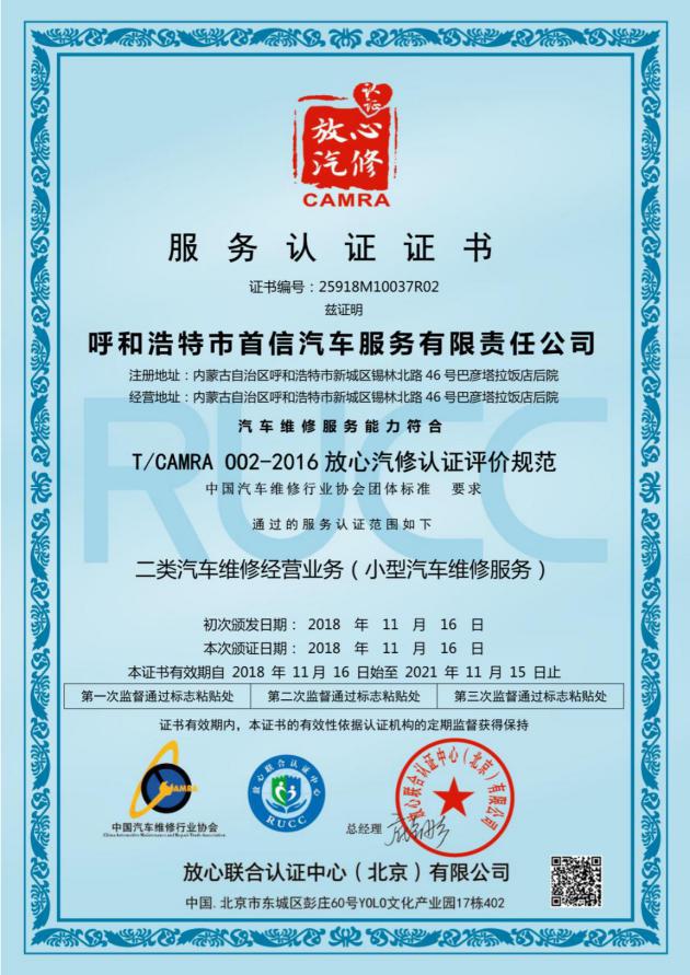 呼和浩特市首信汽車服務有限責任公司位于市中心新華廣場對面巴彥塔拉飯店后院。成立于2009年,是一般納稅人企業,國家二類維修企業,全國放心汽修認證企業,內蒙古汽車行業副會長企業,內蒙政府機關公務用車定點維修采購單位。現擁有員工30多位,是一支維修服務及零件供應為一體的優秀團隊,可做發動機總成大修、中修、保養,鈑金、噴漆、事故維修、裝飾等,公司注冊資金100萬元,總占地面積4000多平米,設有先進、齊全的維修設備、寬敞整潔的維修車間,主修廠房400平米,機修車間400多平米(包括8個兩柱、2個四柱舉升機)、鈑金車間400多平米(包括大梁校正儀、地八卦、整形機)、噴漆車間400多平米(包括無塵烤房)、美容裝具車間400多平米,100多平米的客戶免費洗車房、150多平米的零件倉庫、150多平米的客戶接待室和1500多平米的客戶停車場。客戶可以通過二樓溫馨休閑室觀看到嚴謹有序的維修保養流程和車輛維修全過程。