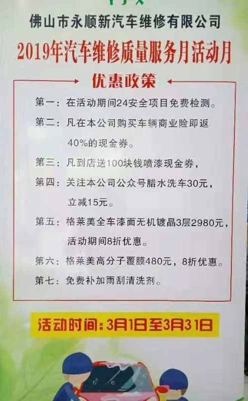 為響應中維協關于開展2019年汽車維修質量服務月活動,佛山市禪城區交通運輸協會倡導了22家會員單位積極參與,以“抓質量,促服務、樹形象,全面提升企業服務水平”為主題,服務廣大車主,便民維修。參與的22家企業在3月1日前紛紛掛一協會統一印制的服務月橫幅,每家企業公示服務項目,如免費檢查車輛故障、更換機油、空調格項目工時費按八折收取等優惠服務,為了跟蹤行業的服務質量,協會支部王桂華書記帶隊到每一家服務企業進行走訪,調查車主反饋情況。以增強服務意識、提高服務水平。