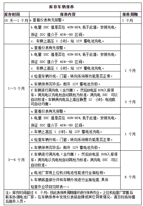注:請(qǐng)廣大的客戶單位對(duì)庫存車輛動(dòng)力電池的維護(hù)保養(yǎng)給予高度重視,嚴(yán)格執(zhí)行,避免不必要的質(zhì)量保修糾紛。