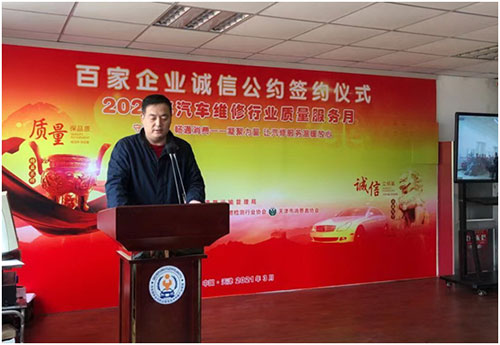天津市汽車維修檢測行業協會會長、黨支部書記宣讀了《汽車維修質量服務月倡議書》,從依法經營、遵章守紀、誠信為本、貨真價實、安全生產、熱情待客、尊重客戶、溫暖服務、接受監督等11個方面向全行業發出倡議。