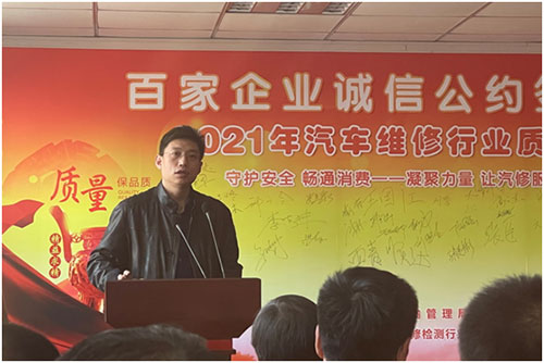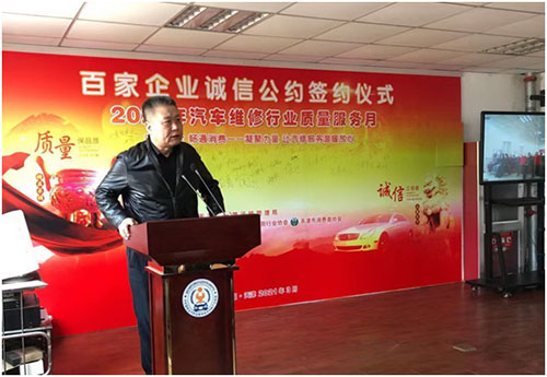 企業代表、天津市柯蘭德汽車銷售維修服務有限公司總經理李合芳代表全體參會企業發言,表示要堅持誠信為本,以優質服務、用戶滿意為宗旨參與市場競爭,公正簽訂并忠實履行汽車維修合同(托修單),不擅自減少作業項目,不使用假冒偽劣配件,不作虛假廣告宣傳。