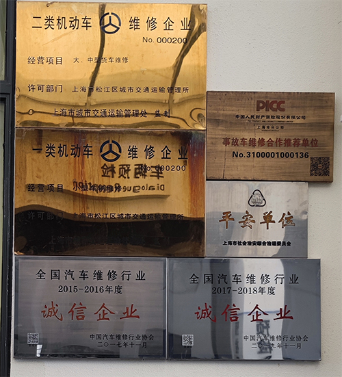 公司堅持“信守合同承諾,滿足客戶要求”,各項指標在松江區汽修行業中名列前茅,受到有關部門多次表彰。公司多年來連續被評為松江區文明單位、松江區先進單位、松江區平安單位、上海大眾優秀服務商、上海市交通港口行業AAA級誠信企業,2005-2006年度上海市文明單位,2008年度上海市平安單位,2015-2016年度、2017-2018年度、2019-2020年度都獲得了全國汽車維修行業誠信企業。