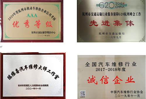 修理廠現(xiàn)為杭州市汽車維配協(xié)會(huì)常務(wù)副會(huì)長單位,浙江省汽車維修行業(yè)協(xié)會(huì)理事單位。曾榮獲“2016杭州交通運(yùn)輸行業(yè)服務(wù)保障G20杭州峰會(huì)先進(jìn)集體”、“全國汽車維修行業(yè)誠信企業(yè)”、“省優(yōu)十佳企業(yè)”、“最具社會(huì)責(zé)任感企業(yè)”、“信用考核AAA優(yōu)秀等級(jí)”、“先進(jìn)企業(yè)”、“汽車維修大師工作室”等榮譽(yù)。修理廠通過交通運(yùn)輸企業(yè)(機(jī)動(dòng)車維修)二級(jí)安全生產(chǎn)標(biāo)準(zhǔn)化建設(shè)、ISO9001(汽車維修)質(zhì)量管理體系認(rèn)證。