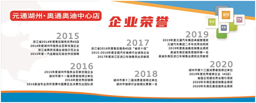 湖州奧通位于湖州市杭長橋北路988號,建筑面積達7510平方米,集整車銷售、服務、零配件銷售、信息回訪為一體的標準4S展廳。公司以誠信、專業(yè)、嚴謹、關愛的服務理念,16年來擁有33765位奧迪車主,提供超過31萬次車輛服務。榮獲2010、2012、2013、2014、2016、2018、2020年度“湖州市消費者信得過單位”稱號,2015、2016年度“全國汽車維修行業(yè)誠信企業(yè)”稱號,2017年度“浙江省放心消費示范店”稱號,2019年度“優(yōu)秀維修企業(yè)(4S店)”稱號。