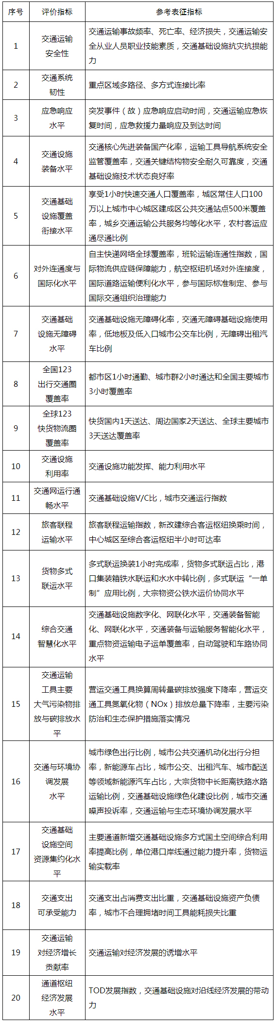 綜合考慮各地區、各行業特點,注重交通運輸與經濟社會、生態環境相協調,統籌發展和安全,圍繞“安全、便捷、高效、綠色、經濟”,從“基本特征、評價維度、評價指標”三級設置20項評價指標。相應設置部分表征指標,供行業、地方制定指標參考,具體見附件