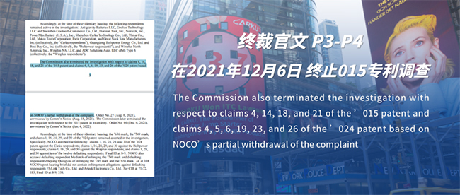 這一無效裁決使得美國NOCO公司發起“337調查”不久后,美國NOCO公司主動撤回了015專利的調查。