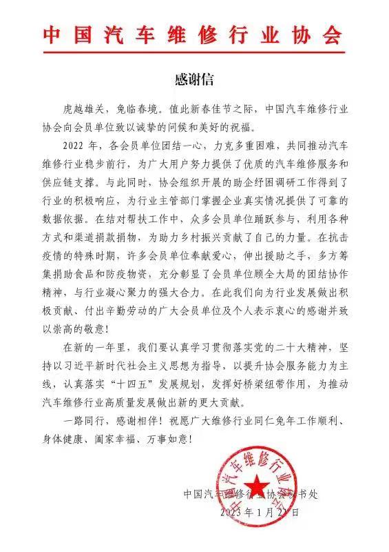 虎越雄關(guān),兔臨春境。值此新春佳節(jié)之際,中國(guó)汽車維修行業(yè)協(xié)會(huì)向會(huì)員單位致以誠(chéng)摯的問(wèn)候和美好的祝福。