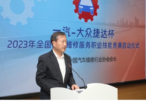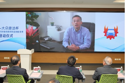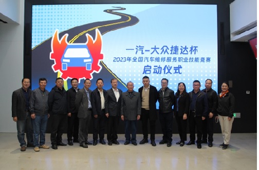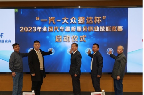 出席儀式現場的領導和專家共同啟動了“一汽-大眾捷達杯”2023年全國汽車維修服務職業技能競賽。