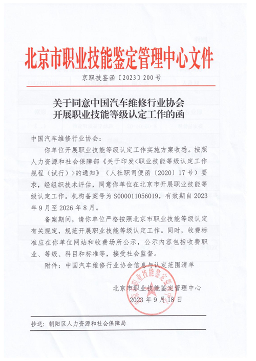 經(jīng)北京市職業(yè)技能鑒定管理中心備案,中國汽車維修行業(yè)協(xié)會獲準開展職業(yè)技能等級認定工作。
