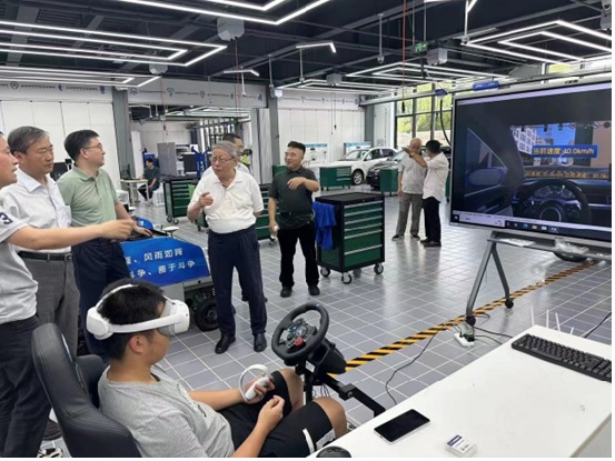 張延華一行首先參觀了學(xué)院的教學(xué)環(huán)境和實(shí)訓(xùn)場地,聽取了李丕毅院長關(guān)于學(xué)校專業(yè)建設(shè)和人才培養(yǎng)情況的介紹,重點(diǎn)了解了智能網(wǎng)聯(lián)專業(yè)建設(shè)的全國領(lǐng)先優(yōu)勢,以及MR混合現(xiàn)實(shí)技術(shù)在教學(xué)實(shí)踐中的應(yīng)用。張延華對上海交職院汽車工程學(xué)院在教學(xué)、科研方面取得的不俗業(yè)績表示高度認(rèn)可,對其在產(chǎn)教融合方面取得的豐碩成果予以高度肯定。他希望協(xié)會和學(xué)校在產(chǎn)教融合、技能競賽、標(biāo)準(zhǔn)化等方面加強(qiáng)聯(lián)動,互相助力提升,也歡迎學(xué)院積極參與協(xié)會教育培訓(xùn)分會換屆工作,發(fā)揮重要作用。