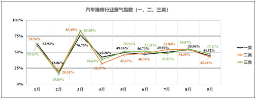 各類汽車維修企業景氣指數結果表明,一、二、三類維修企業景氣指數變化趨勢均與整體景氣指數保持一致。其中,一類企業景氣指數波動較小,表明汽車大修和總成修理需求受各類因素變化浮動相對較小。2024年5-9月,三類維修企業景氣指數分別為50.5%、51.3%、47.9%、55.1%、47.1%,除7月份外,其余月份三類企業景氣指數均高于一類、二類維修企業,表明汽車專項修理和維護需求受旅游旺季自駕出行、電商活動影響更為明顯。