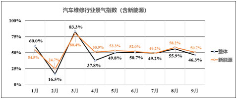 我會聯合大連海事大學綜合交通運輸智能技術與裝備教育部工程研究中心(以下稱“研究中心”),發布2024年前三季度中國汽車維修行業景氣指數(以下稱“景氣指數”)。2024年1-9月,景氣指數分別為60.0%、16.5%、83.3%、37.8%、49.8%、50.7%、49.2%、55.9%、46.3%。