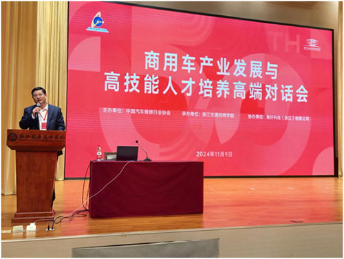 張延華作為主辦方致辭。他表示中國汽車維修行業協會自成立以來,高度重視汽車維修行業發展及行業人才隊伍建設,積極推動中國商用車企業與技工院校人才培養緊密聯系,為行業人才培養發揮積極作用。他強調,商用車產業是國民經濟不可或缺的組成部分,我國商用車市場是全球最大、最有發展潛力的市場,協會同樣高度重視商用車后市場發展,正在籌備成立商用車維修分會,并向人社部申請設立了商用車維修工新職業工種,推動制定商用車維修工國家職業技能標準,即將舉辦國家二類賽事——商用車維修職業技能競賽。他指出,浙江交通技師學院始終立足交通、服務交通,深化產教融合、校企合作,成為支撐汽車產業轉型升級和技術創新的重要力量。張會長希望大家充分利用這次難得的機會,就商用車產業發展、技術創新、市場需求以及高技能人才培養等關心的話題,展開深入交流探討,充分凝聚智慧,碰撞思想火花,謀劃新發展機遇,為產業技術創新、市場拓展以及推動產教深度融合注入強勁動力,為助力商業車產業和汽車維修業高質量發展做出新的更大貢獻。