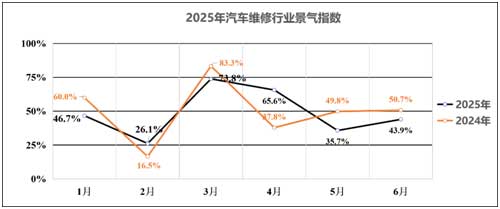 結果顯示,2025年二季度汽車維修行業景氣指數波動較大,總體呈現先下降后上升態勢,4月、5月分別環比下降了8.2、29.9個百分點,6月份環比上升了8.2個百分點,結果表明上半年汽車維修業務量主要集中于3-4月份,進入5、6月份后汽車維修行業景氣指數呈現下降趨勢;同時2025年二季度汽修行業景氣指數同2024年同期相比差異明顯,其中4月份同比提升了27.8個百分點,5月、6月分別下降了14.1、6.8個百分點。