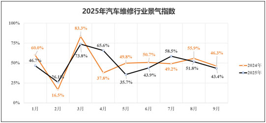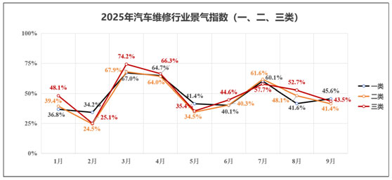 近日,我會聯合大連海事大學綜合交通運輸智能技術與裝備教育部工程研究中心,發布了2025年第三季度汽車維修行業景氣指數。2025年7-9月,景氣指數分別為58.5%、51.8%、43.4%。