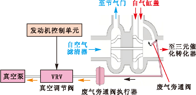 如圖4所示,發動機控制單元根據發動機冷卻液溫度、發動機轉速、負荷等信號,對真空調節閥(VRV)進行占空比控制,使廢氣旁通閥執行器在由真空泵(由排氣凸輪軸驅動)產生的真空力的作用下控制廢氣旁通閥的開度,讓部分廢氣從廢氣旁通閥排出,調節流過渦輪的廢氣量,從而有效控制進氣增壓壓力,使之與發動機工況相適應。