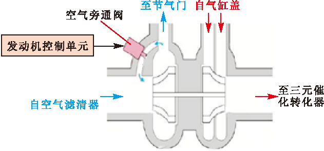 如圖5所示,當發動機工況急劇變化或其他因素引起增壓壓力急劇上升時,如急加速后急松加速踏板,發動機控制單元控制空氣旁通閥使渦輪增壓器前后的空氣導通,保持壓力平衡,可有效避免空氣喘振及葉輪損壞,同時能使渦輪保持在較高轉速,在需要時能更迅速地向發動機提供所需的增壓壓力,減小渦輪增壓器的遲滯現象。