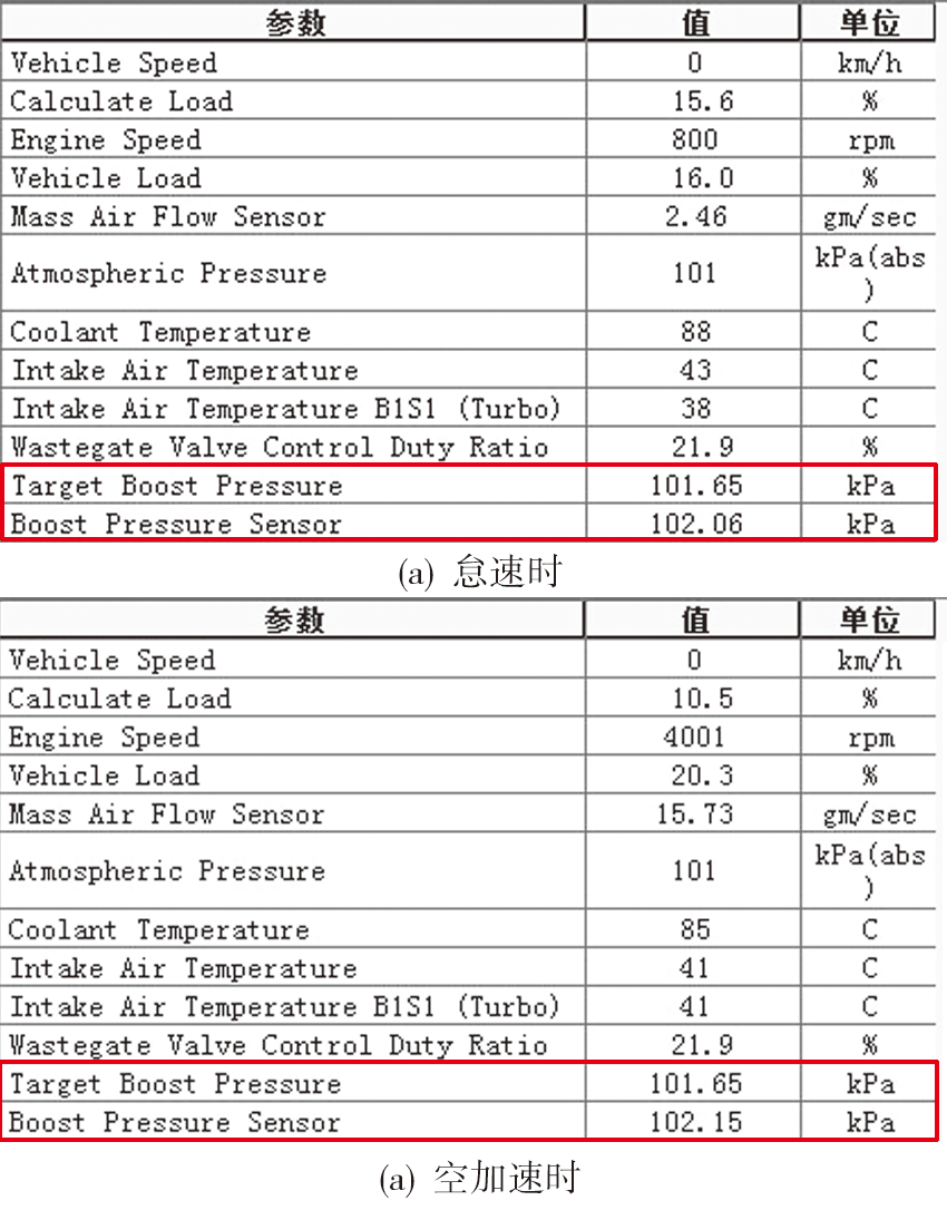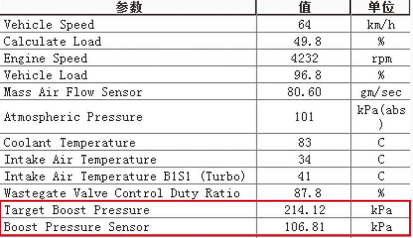 圖8 增壓壓力不足時的發動機數據流(截屏)