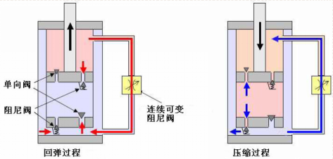如圖9所示,CDC減振器的工作過程分為拉伸行程和壓縮行程,具體工作原理如下。
