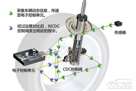 連續可變阻尼控制懸架控制系統又稱CDC(Continuous Damping Control)懸架控制系統,屬于半主動懸架控制系統,其按照路面情況和行駛條件,利用電磁閥連續調節減振器的阻尼,以確保最佳的操控穩定性和乘坐舒適性。該懸架控制系統在奇瑞瑞麒G6轎車及別克2009款君越轎車上有所應用。