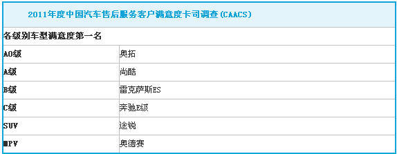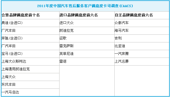 2012年11月16日,2011年度中國汽車售后服務客戶滿意度卡思調查結果在北京發布。奧迪、進口大眾、眾泰汽車分別成為合資品牌、進口品牌、自主品牌售后服務客戶滿意度第一名。汽車行業在經歷幾年井噴式的銷售增長之后,所面臨一個重大的問題即是要為急速提升的汽車保有量提供相匹配的高品質的售后服務。汽車后市場服務的規范化和質量控制對前汽車行業良性發展起到直接而且至關重要的作用。