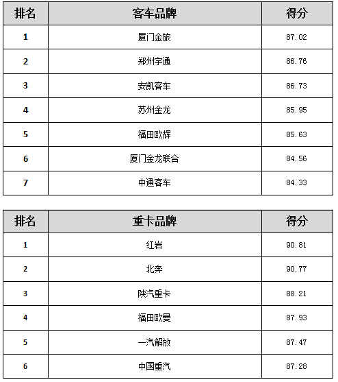本次調查首次對商用車體系售后服務客戶滿意度做出排名。2017年商用車體系售后服務滿意度得分為85.4分,其中重卡85.6分比客車85.1分略高,紅巖和廈門金旅分別名列重卡和客車品牌滿意度第一名。其中,紅巖、北奔、陜汽重卡榮獲重卡體系前三甲,而客車體系售后服務滿意度前三甲為:廈門金旅、鄭州宇通和安凱客車。