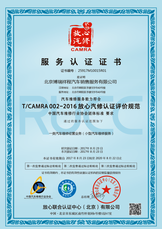 總經理王秋桐寄語:通過放心汽修服務認證,促使博瑞祥程店服務品質有了更大的提升,通過持之以恒、堅持不懈的努力,全面提升了汽車維修行業的整體服務水平,樹立良好社會形象,為客戶提供更加誠信透明、經濟優質、便捷周到、滿意度高的汽車維修服務,放心汽修將讓汽車售后維修客戶更有信心!