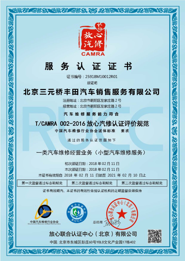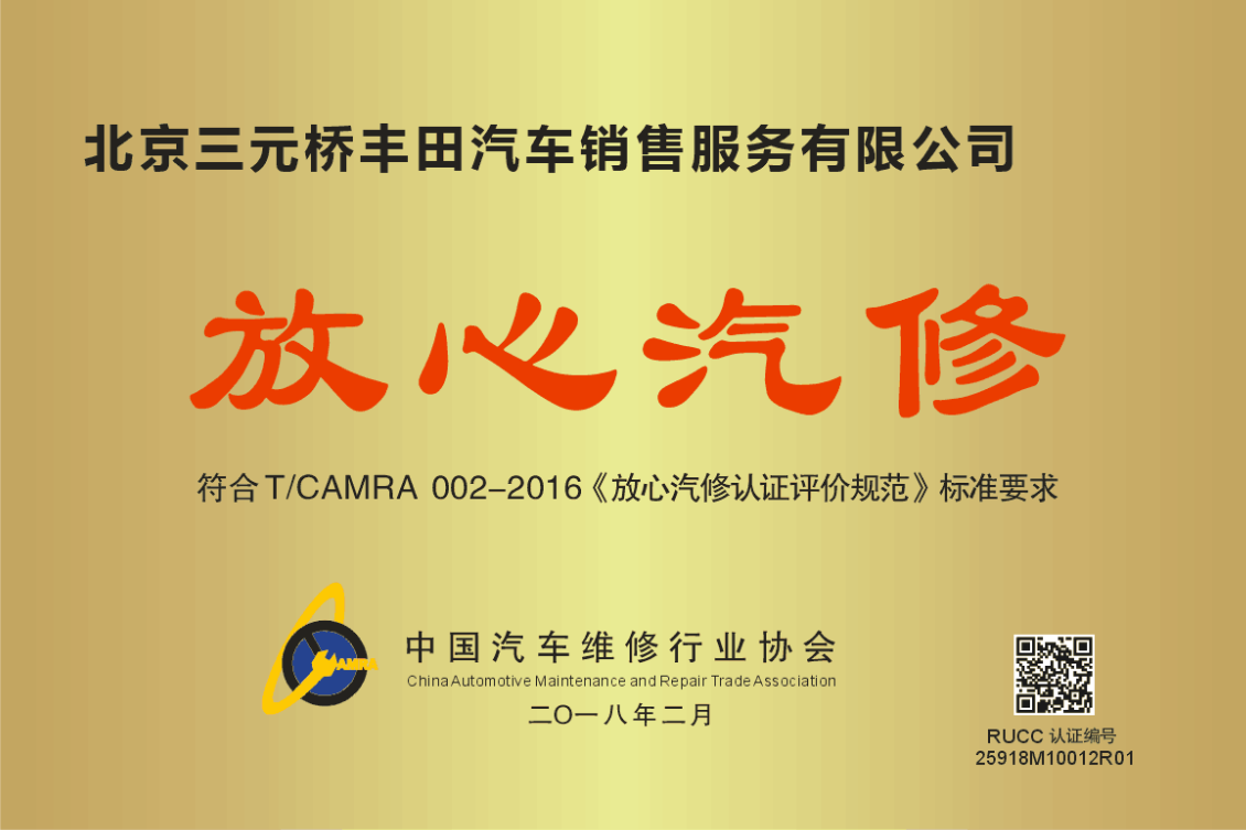 北京三元橋豐田30年的維修經驗和品牌戰略,學習和吸收豐田汽車公司先進的管理經驗、高標準的服務體系、高質量的維修技術得到用戶的一致認可,先后榮獲“北京市誠信服務企業和守信服務企業”、“北京市誠信經銷商”和“全國誠信企業”稱號。