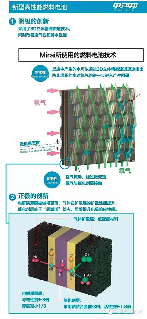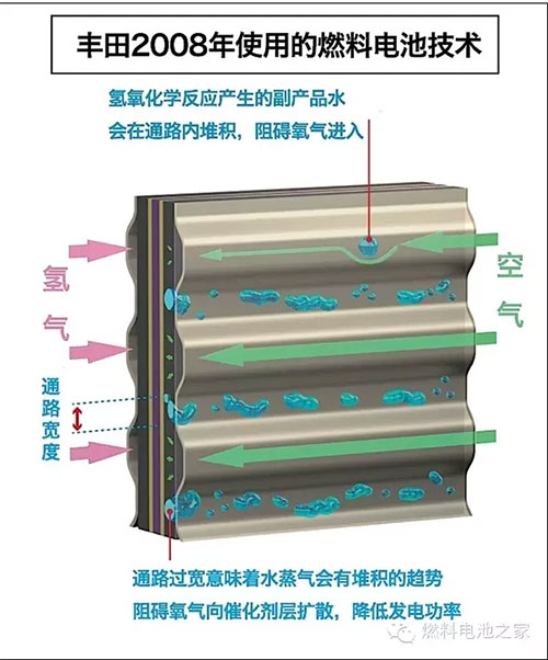 豐田Mirai搭載的燃料電池堆棧是由370片薄片燃料電池組成的,因此被稱為“堆棧”,一共可以輸出114千瓦的發(fā)電功率。此前我們也分析了大眾集團(tuán)的燃料電池技術(shù),結(jié)構(gòu)基本類似。豐田的燃料電池堆棧經(jīng)歷了十幾年的技術(shù)優(yōu)化,形成了自己的特色結(jié)構(gòu),比如3D立體微流道技術(shù),通過(guò)更好地排出副產(chǎn)物水,讓更多空氣流入,有效改善了發(fā)電效率。所以整個(gè)堆棧的發(fā)電效率達(dá)到了世界先進(jìn)水平,達(dá)到了3.1千瓦/升,比2008年豐田的技術(shù)整整提升了2.2倍。